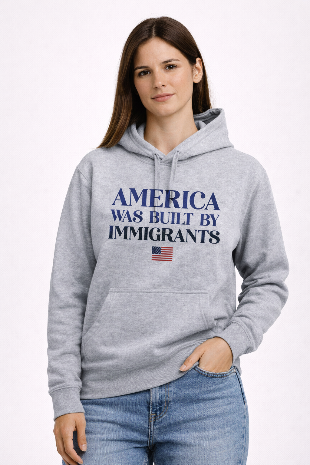This design highlights a truth woven into the foundation of the country—that generations of immigrants brought their labor, culture, ideas, and determination to help build what America is today. Simple, direct, and unmistakable, the message stands as a reminder that the nation’s strength has always come from people arriving with hope and the willingness to work for a better future.
