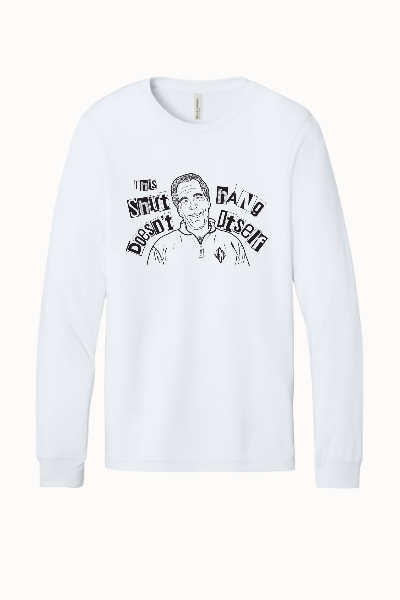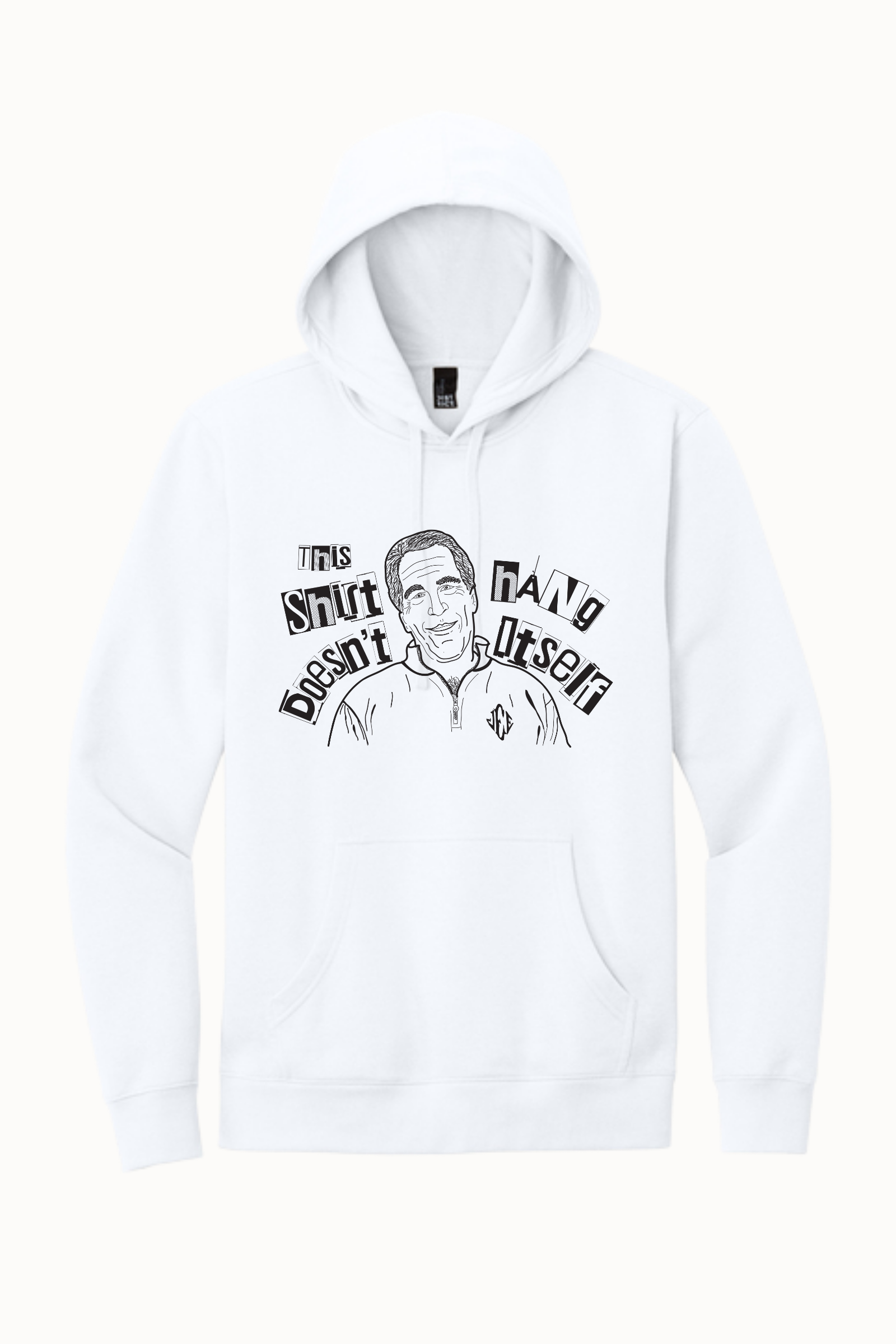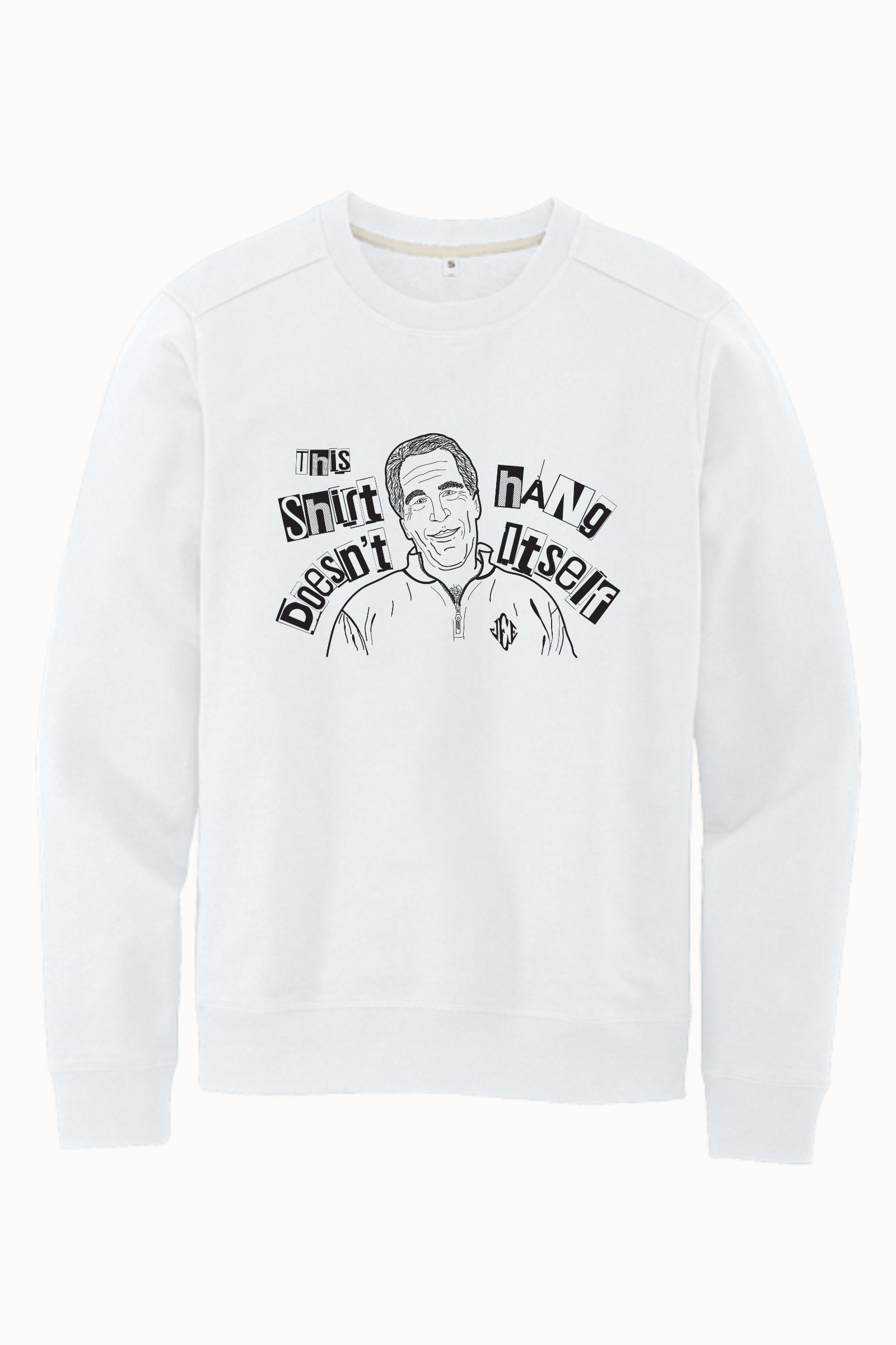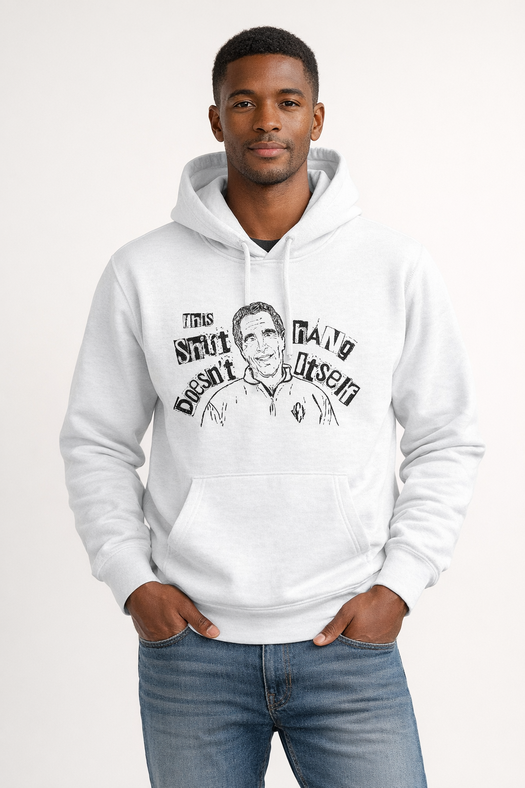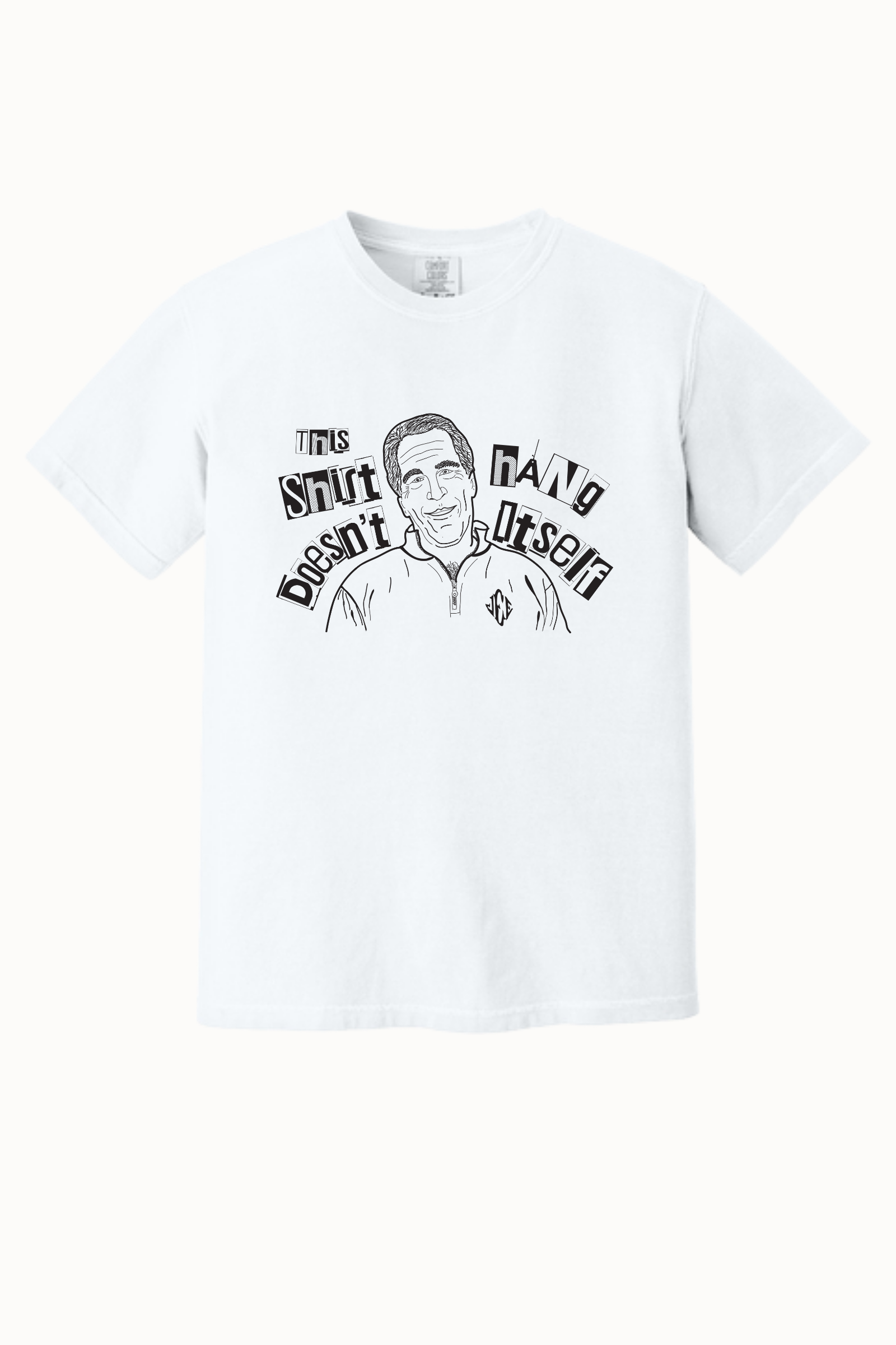 This design blends sharp humor with bold commentary, pairing a hand-drawn portrait with distressed, cut-out style lettering that reads: “This Shirt Doesn’t Hang Itself.” The collage-style typography and raw illustration give the piece a rebellious, underground feel—like something pulled from a protest poster or a late-night idea that refused to stay quiet.